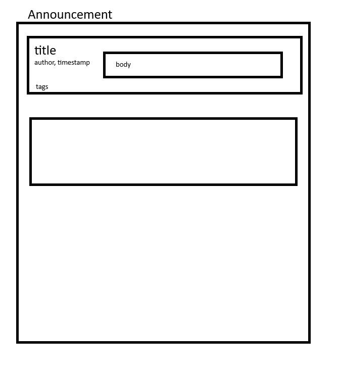 - For an announcement feature, I’m going to need an ID (standard in every database), author, title, body, time, and tags data